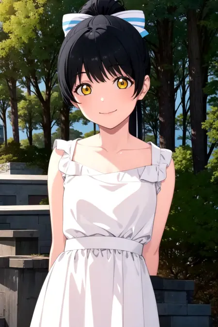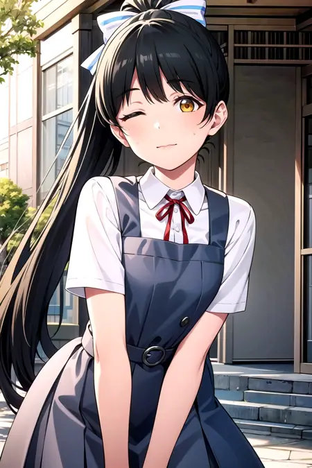 필요한 태그: 1girl, solo, hazuki ren, 높은 꼬리머리, 노란 눈, 앞머리, 검은 머리, 머리끈, 긴 머리