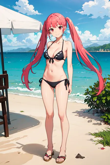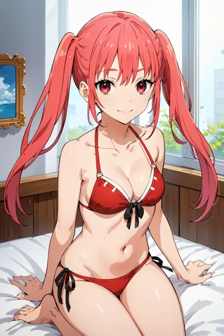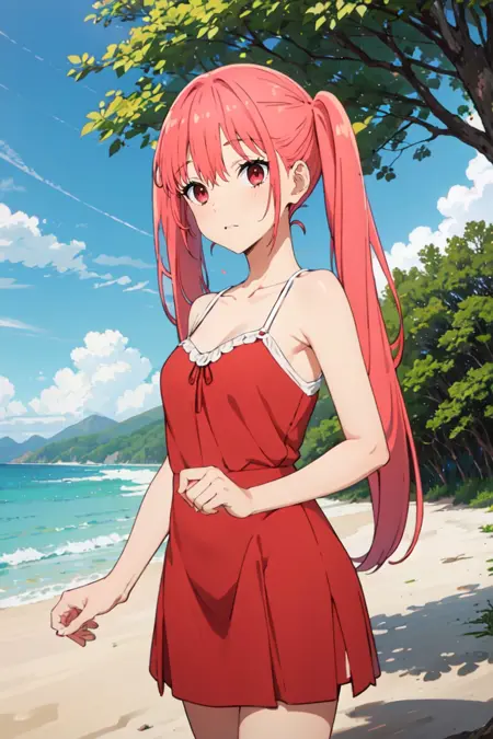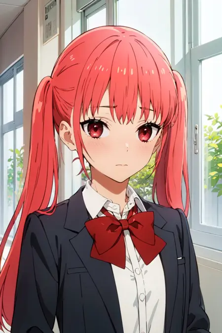 그녀의 _원래 옷_을 사용하려면 다음 태그를 사용하세요: pikkyremi, 1girl, solo, looking at viewer, red hair, pink hair, long hair, twintails, bangs, red eyes, breasts, small breasts, school uniform, bow, bowtie, jacket, red bow, shirt, blazer, white shirt, collared shirt, red bowtie, skirt,