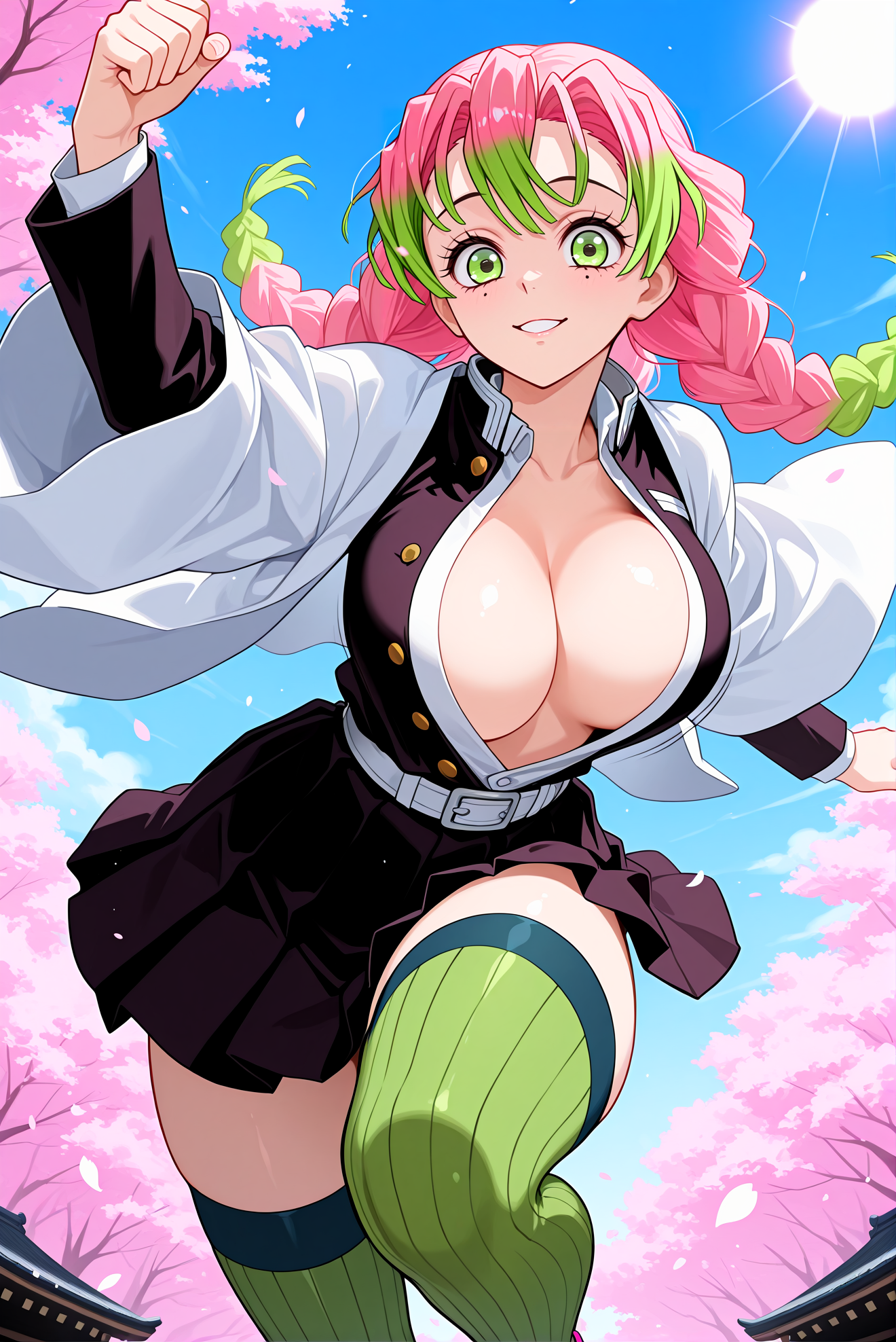 ベースプロンプト: m1t5ur1、ピンクの髪、緑の髪、多色の髪、緑の目、目の下のほくろ、長い髪、編み髪、