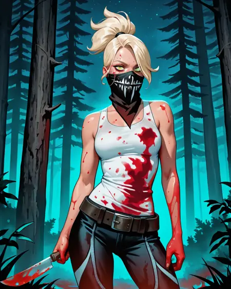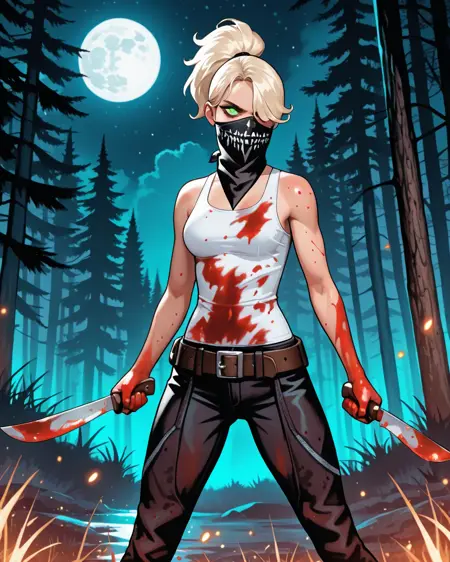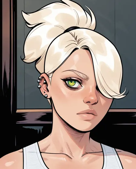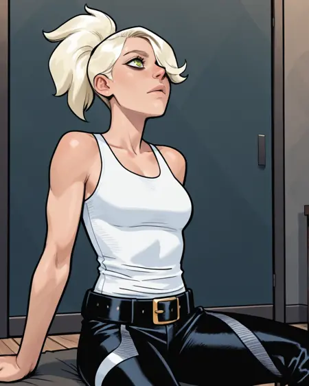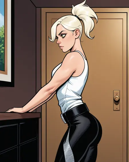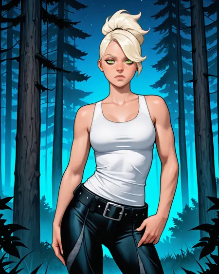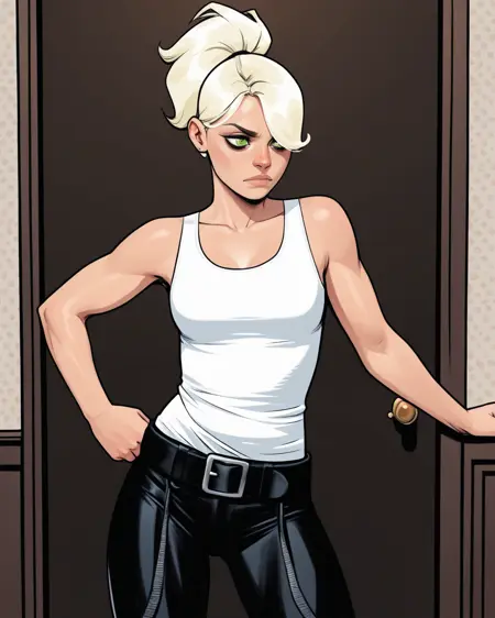 触发词:ericaslaughter, 1girl, blonde hair, ponytail, green eyes, tank top, belt, pants