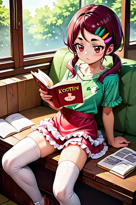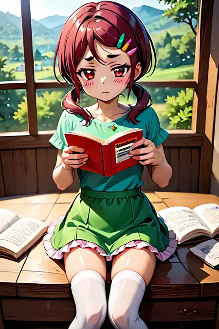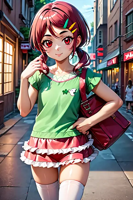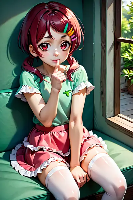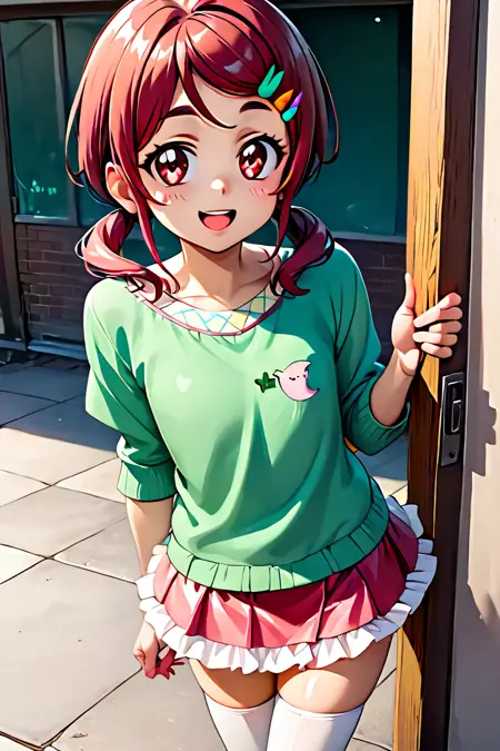 kotori, 1girl, solo, ワイズハイ,ツインテール, 赤髪, スカート, 髪飾り, ヘアクリップ, 白いワイズハイ, 赤い目, シャツ, フリルスカート, 短い髪, 緑のシャツ, 短い袖, ピンクのスカート,