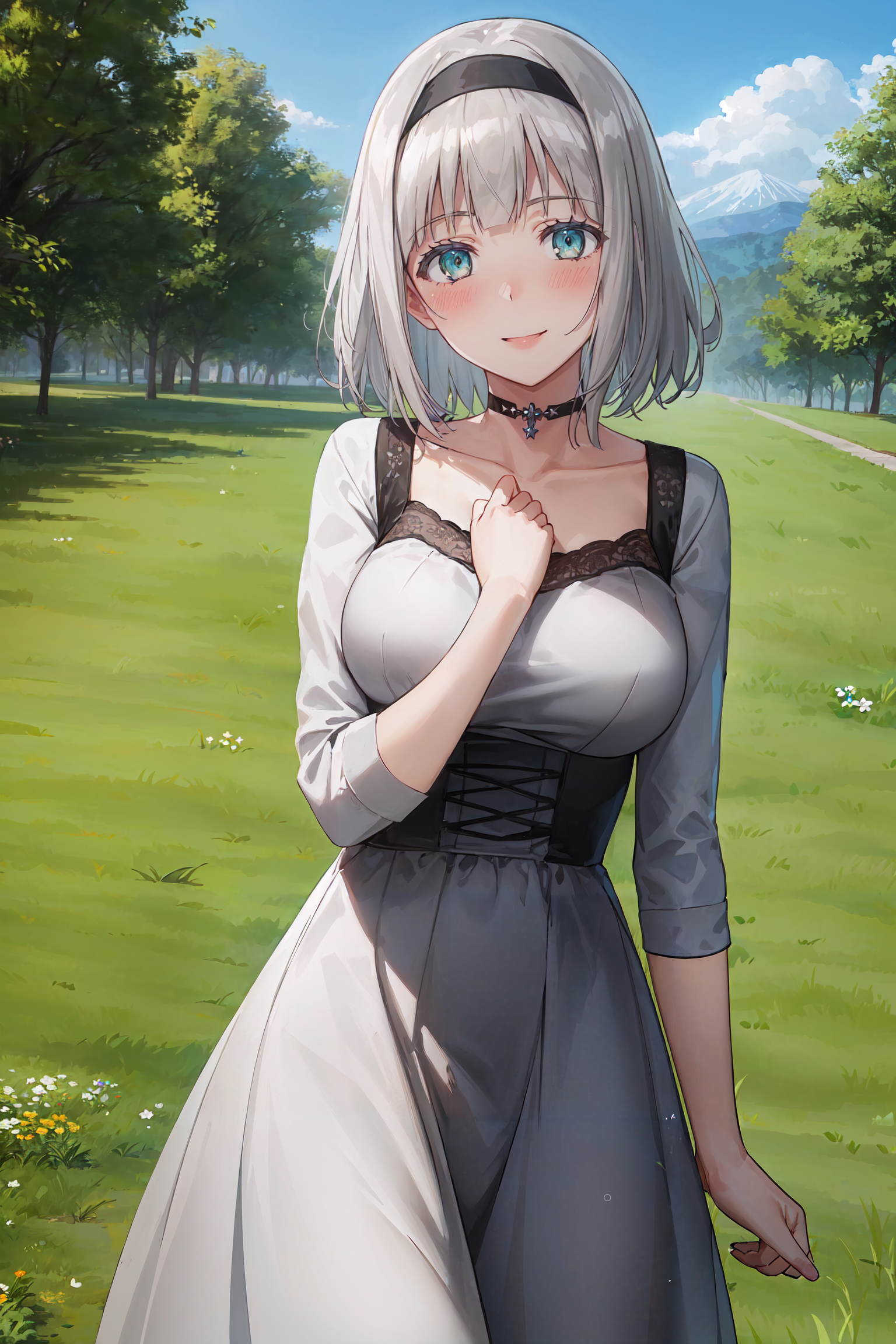 • 캐릭터 트리거: 회색 머리카락, 중간 길이 머리카락, 청록색 눈, 큰 가슴