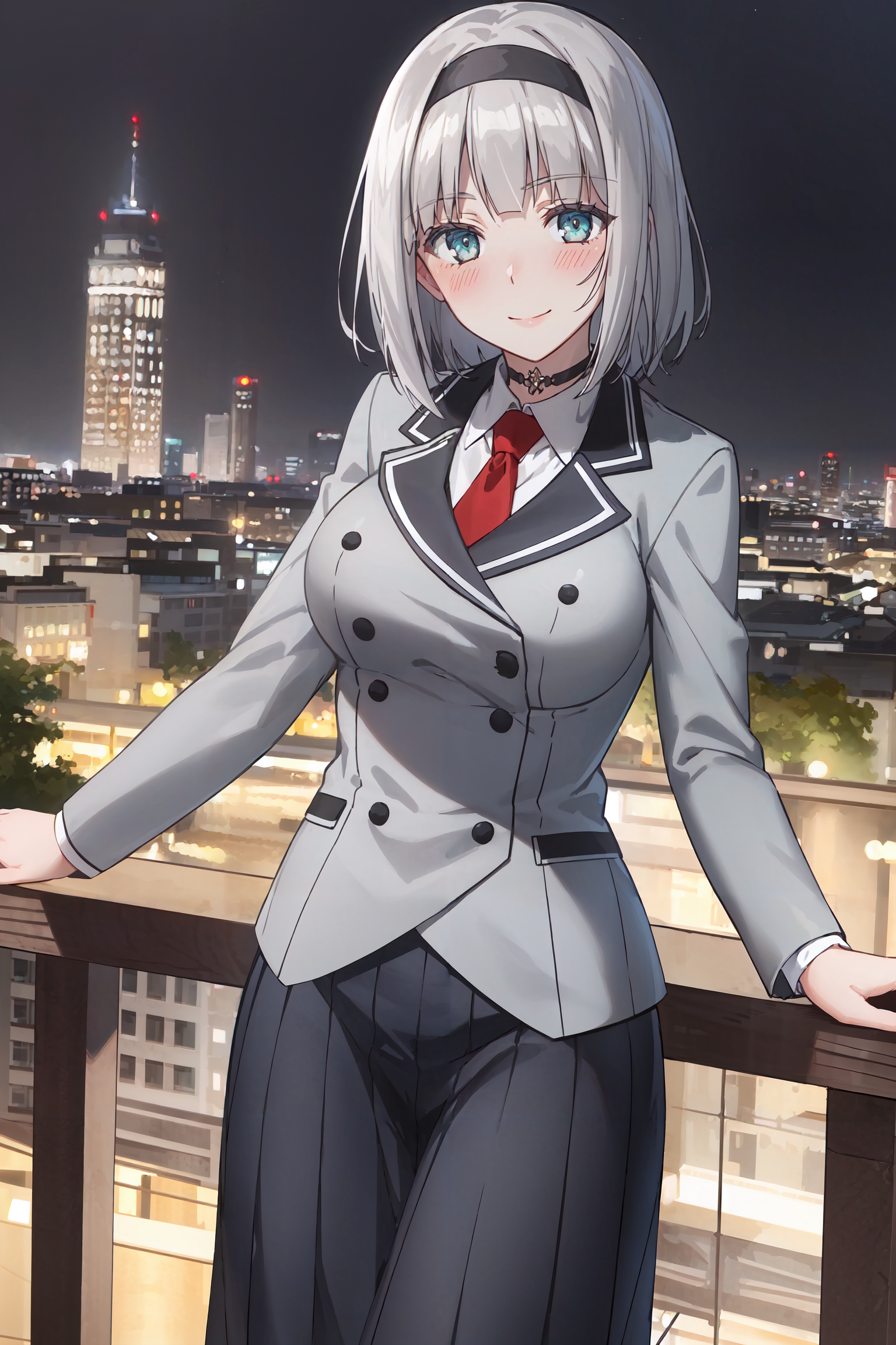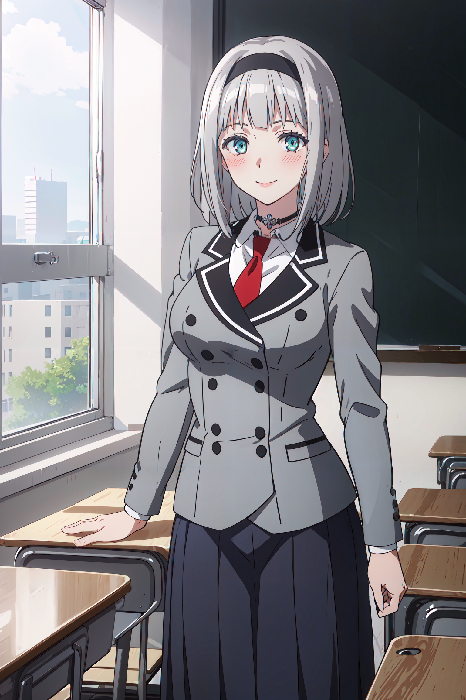 • 복장: 초커, 검은 머리띠, 학교 유니폼, 회색 자켓, 빨간 넥타이, 긴 치마