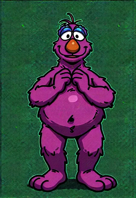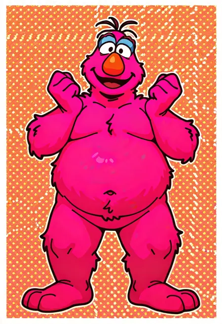 TellySS, 1boy, shaggy magenta fur, large orange nose, wide expressive black eyes, blue eyelids, pink hair, fat, chubby,