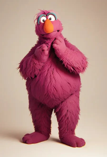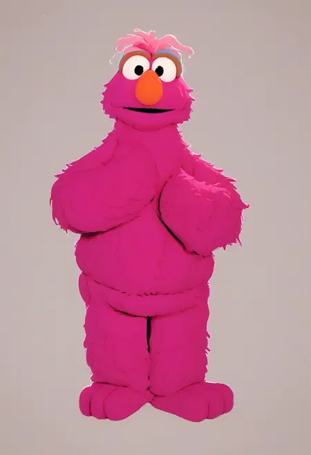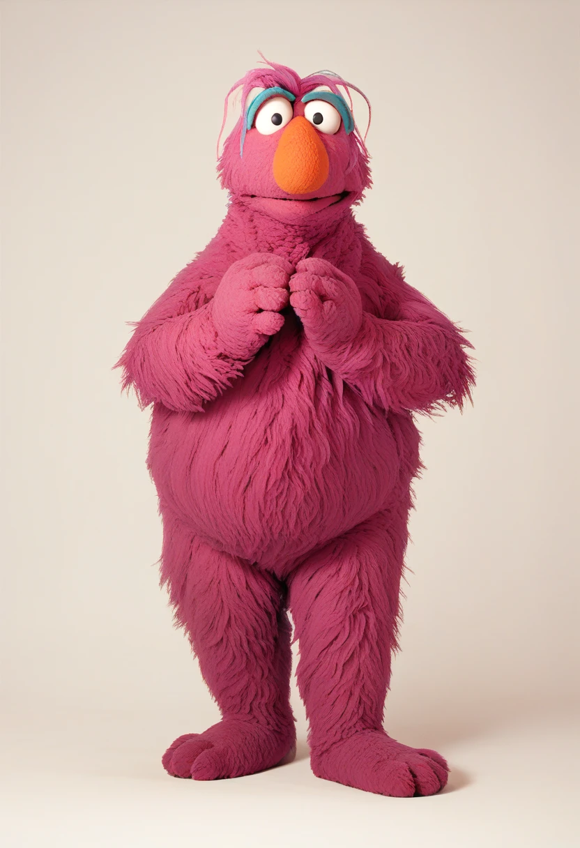 TellySS, 1boy, shaggy magenta fur, large orange nose, wide expressive black eyes, blue eyelids, pink hair, fat, chubby,