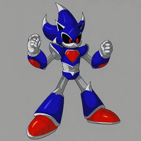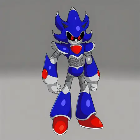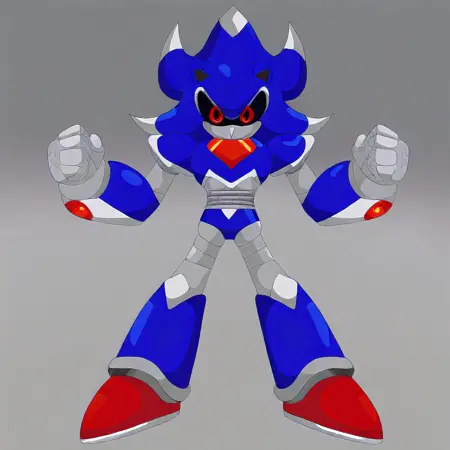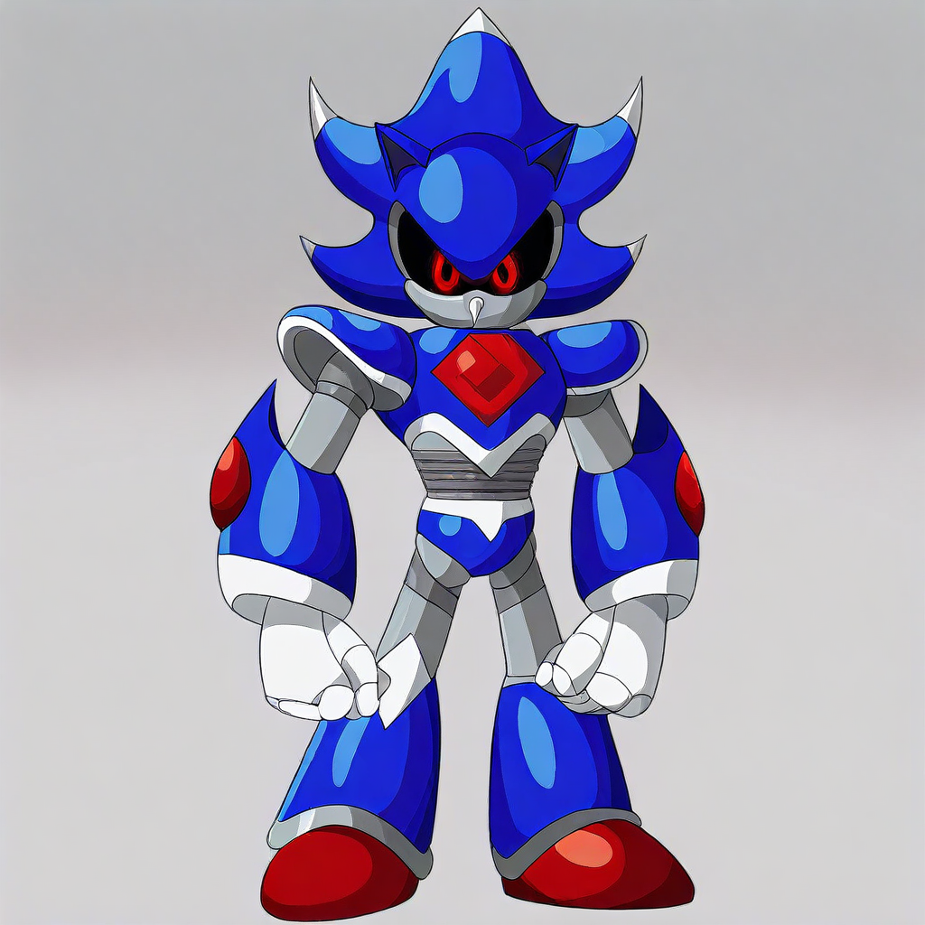Metallix, red glowing eyes, robot, glowing red energy core, blue metal skin, black sclera, pointy metal nose, red shoes, clenched hands, red orbs on its forearms, white details on its edges, white spikes on its head, thruster on its back, solo,