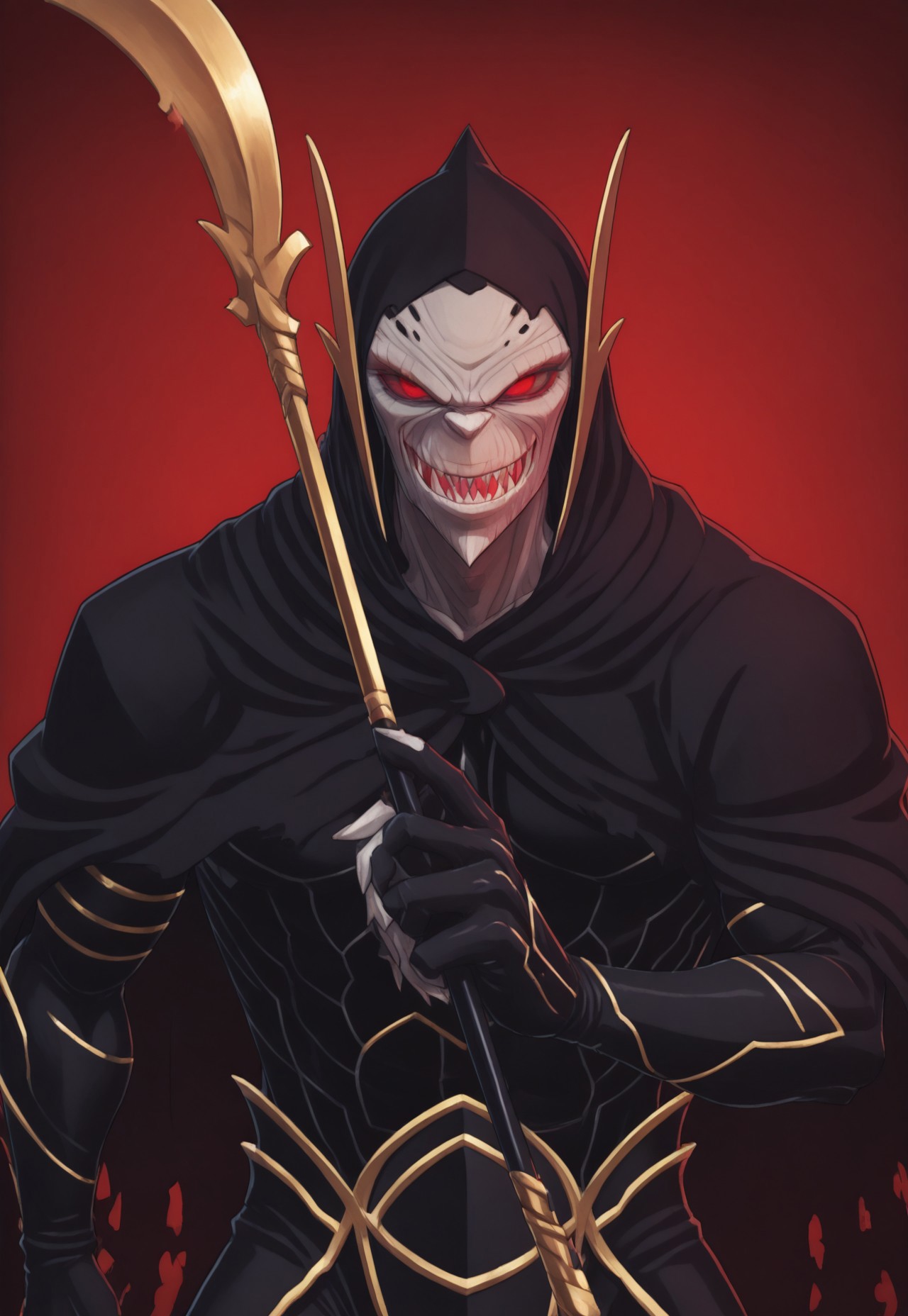| トレーニングワード | 1male, solo, toned male, Marvel, CorvusGlaive, Black cloak, black hood, gold headgear, Alien male, grey skin, grey-skinned male, colored skin, red sclera, no pupils, glowing eyes, sharp teeth, black bodysuit, gold trim, armor, claws,コピーしました! Optional: weapon, Glaive, gold Glaive, holding Glaiveコピーしました! |