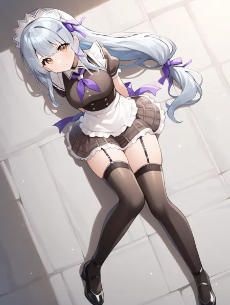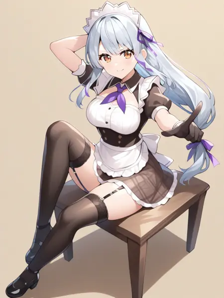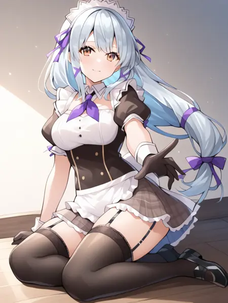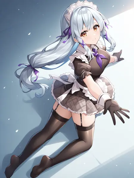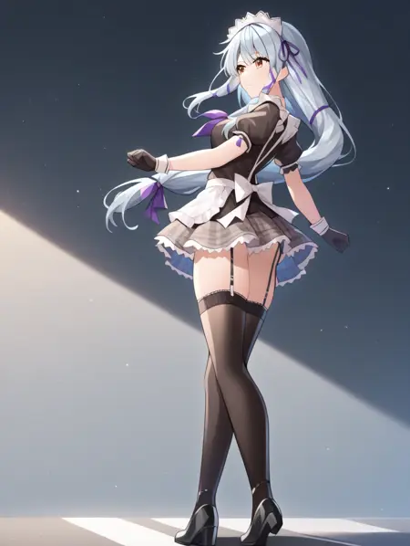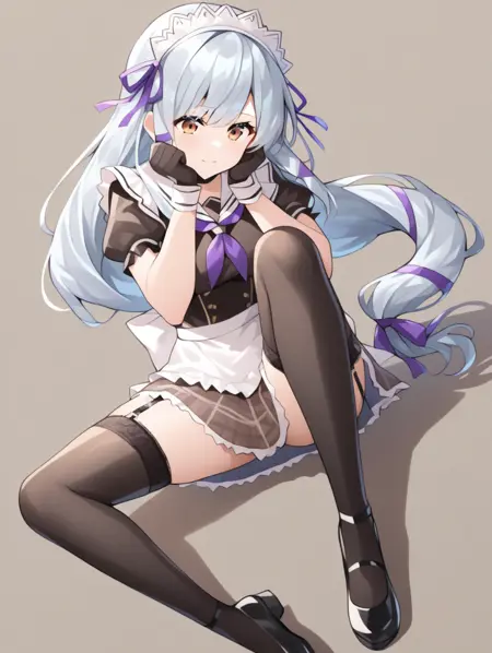 提示示例:meido,solo,full body,maid,maid headdress,frilled apron,brown miniskirt,garter belt,black thighhighs,plaid,neckerchief,black gloves,puffy short sleeves,purple ribbon,grey hair,brown eyes,hair ribbon,low-tied long hair,
