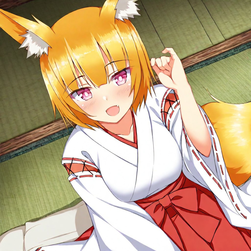 キツネガール – キツネガール、金色の髪、キツネの耳、キツネの尻尾、ピンクの瞳、短い髪、小さな胸
