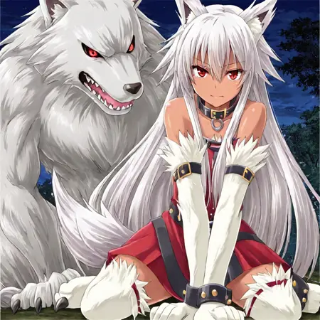 ウルフガール – ウルフガール、狼の耳、狼の尻尾、白髪、赤い瞳、長い髪、肌が濃い、小さな胸