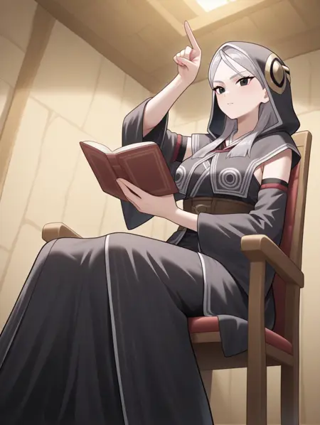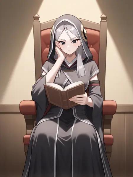 提示词示例:erena,灰发,黑眼,连帽,宽袖,臂套,黑袍,白线,坐着,椅子,手持书本,阅读,唯一的眼睛,tareme,帽檐上有金色图案,微微笑,