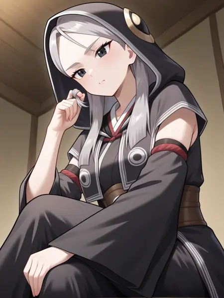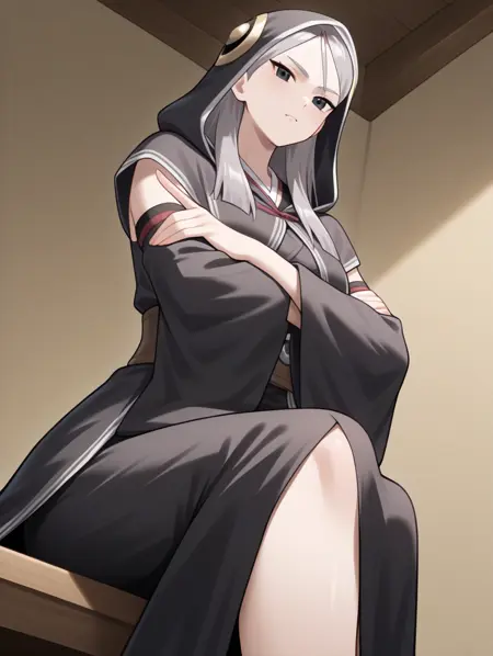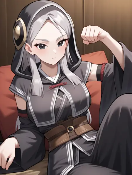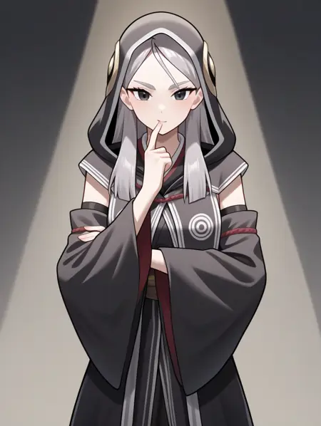 프롬프트 예시: erena, 회색 머리, 검은 눈, 후드, 넓은 소매, 팔 소매, 검은 로브, 흰색 선, 앉아 있음, 의자, 책을 들고 있음, 책을 읽음, 유일한 눈, tareme, 후드에 금색 무늬, 가벼운 미소,