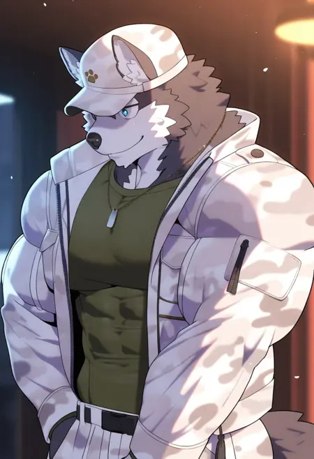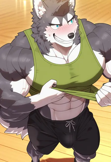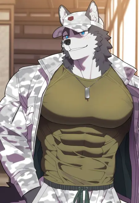 強化プロンプト:「フーリー、ハスキー、尾、青みがかった灰色の毛、白い手、白い足、青い目、筋肉質、男性的、バラ、大きな胸板」