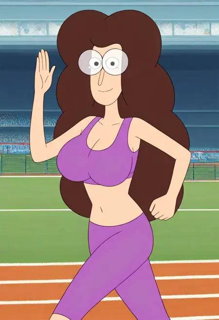 1girl, solo, MelanieBaker_C, 밝은 피부, 검은 눈, 볼륨 있는 푹신한 머리카락, 짙은 갈색 머리카락, 긴 머리, 큰 둥근 안경