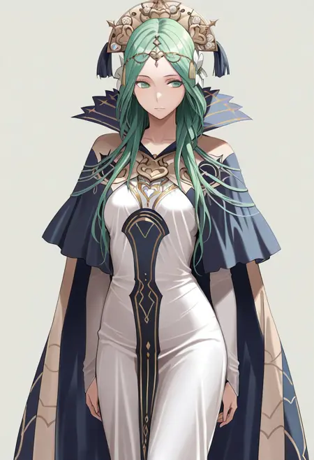RheaDef, green hair, long hair, hair ornament, green eyes, dress, white dress, cape,