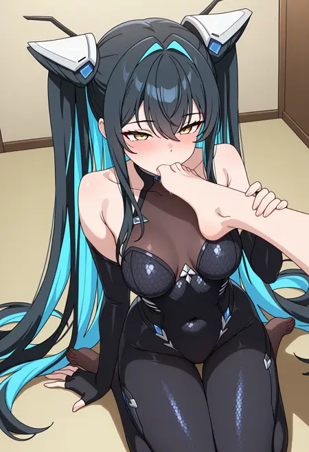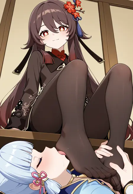 shitoesuck, toe sucking, foot worship, licking foot, multiple girls, hair ornament, 2girls, sitting, closed eyes, yuri, feet, legs, toes, soles, no shoes, black pantyhose, licking, foot focus, femdom, holding another's foot,