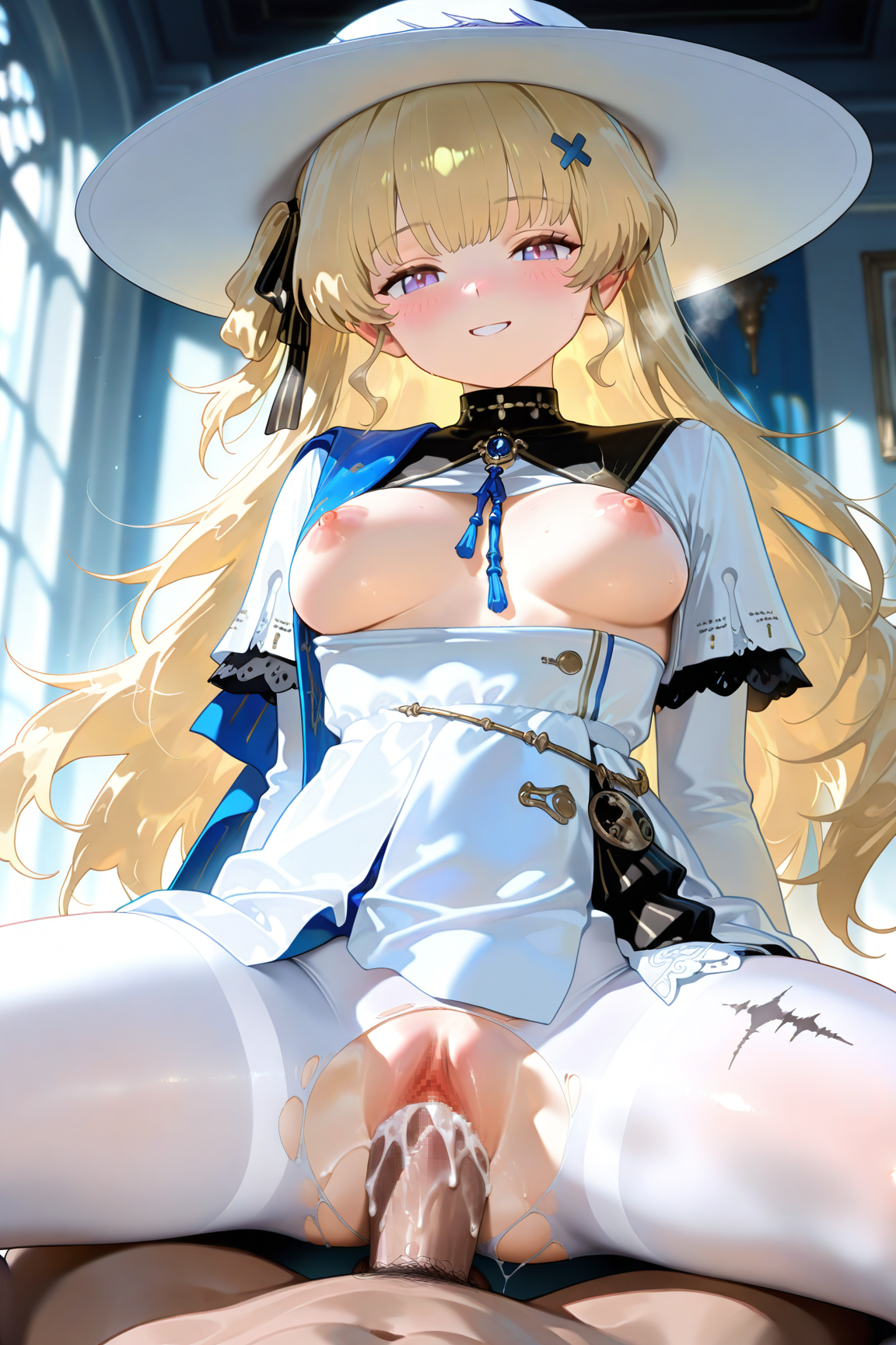 phoebe \(wuthering waves\),1girl,gloves,solo,long hair,dress,white dress,hat,white headwear,hair ornament,one side up,long sleeves,