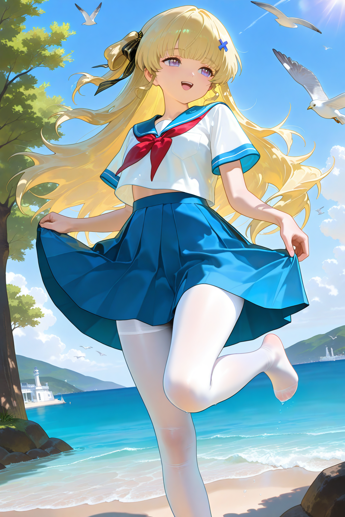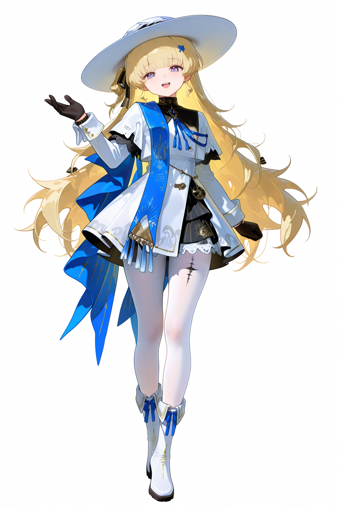 phoebe \(wuthering waves\), 1girl, solo, long hair, hat, gloves, smile, black gloves, dress, white headwear, white dress, white pantyhose, very long hair, pantyhose, official alternate costume, hair ornament, long sleeves, ribbon, hair ornament, jewelry, sun hat,