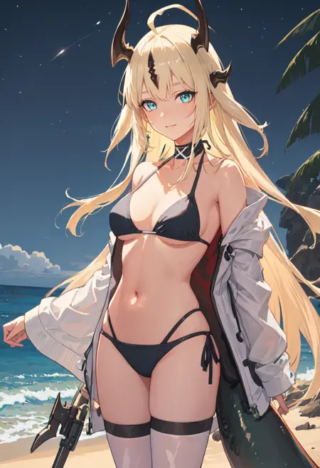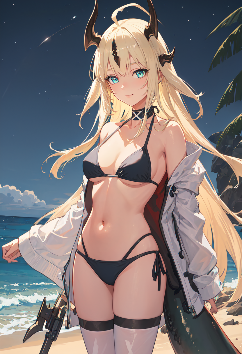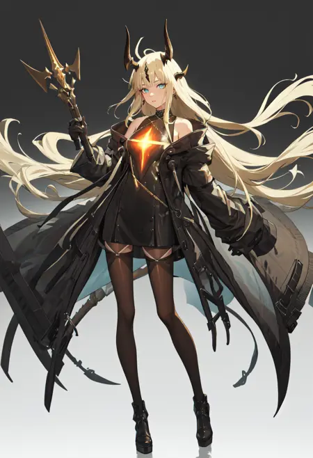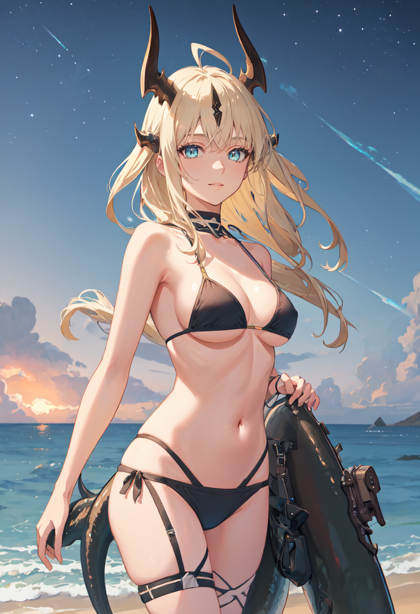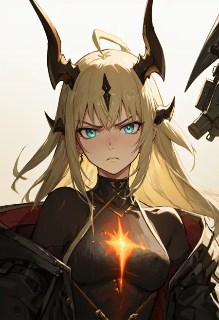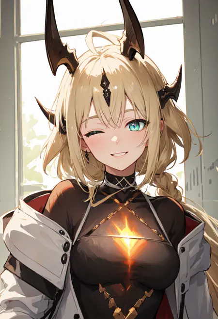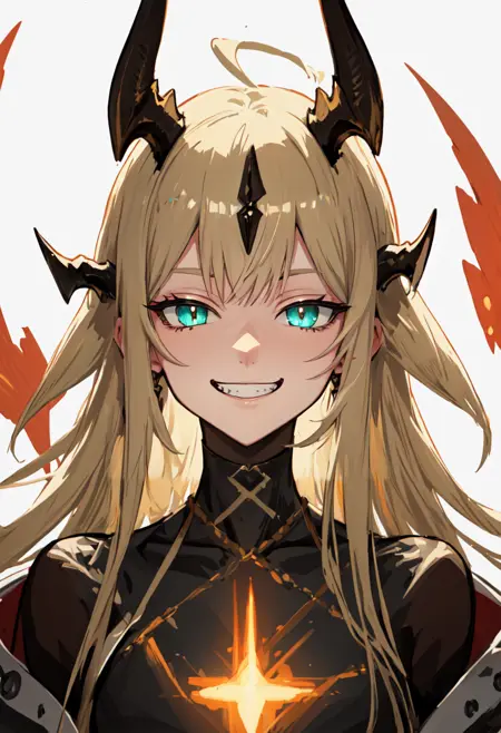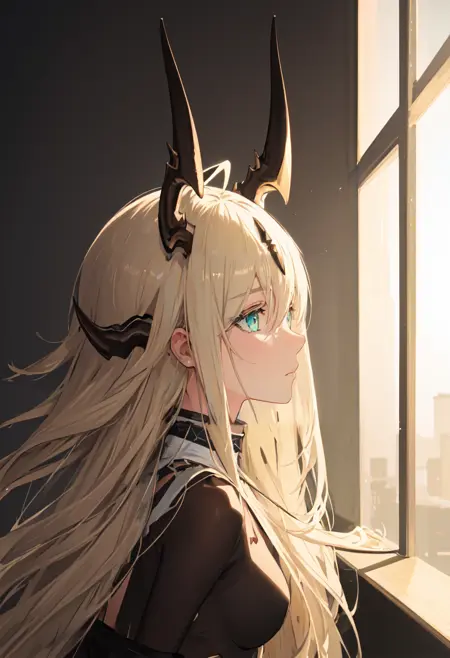 The trigger word is reed_arknights, and the pruned tags are horns, long_hair, dragon_horns, blonde_hair, dragon_girl, ahoge, tail, breasts, dragon_tail, green_eyes, blue_eyes, very_long_hair. When some features (e.g. hair color) are not so stable at some times, you can add these them into your prompt.