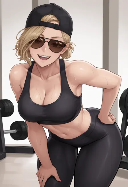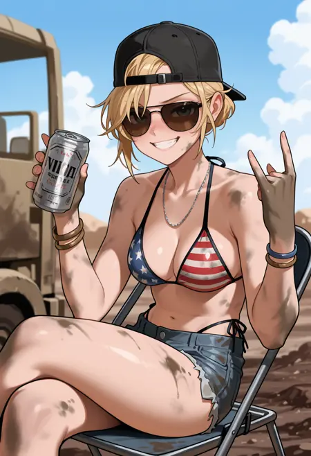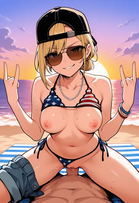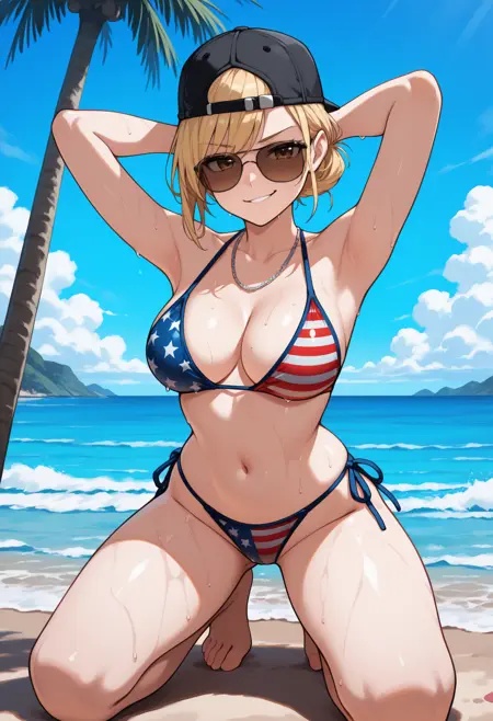 Default Outfit: black headwear, baseball cap, backwards hat, sunglasses, american flag bikini, blue shorts, denim shorts, short shorts, necklace, bracelet
