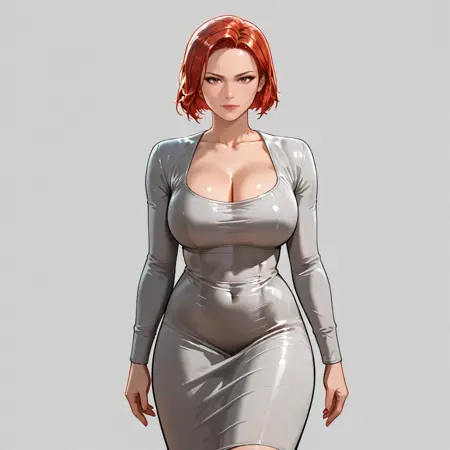 クリアバス無しのトリガー:blackwidow, 1girl, red hair, large breasts, bodysuit, marker (medium), belt, gloves, lips, short hair, blue eyes, cowboy shot