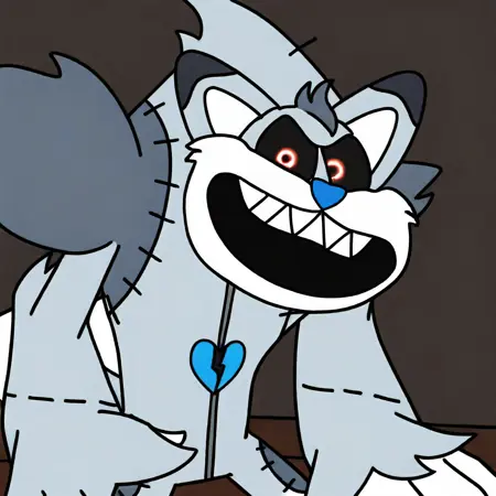 frownyfoxbbi, 1boy, furry, solo, sharp teeth, grey fur, white fur, two tone fur, blue heart pendant, black sclera, red irises, stitches,