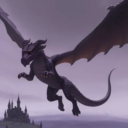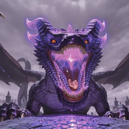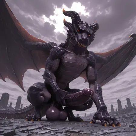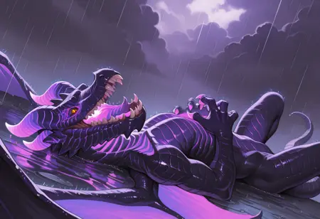 一般的なタグ:ドラゴン、翼、フェラル(人間化しても可)、尾、オレンジ色の目、濃い紫の鱗、角、爪、モンスター、鋭い歯、人間なし、巨大(オプション)、光る目(オプション)、飛行(オプション)、舌(オプション)