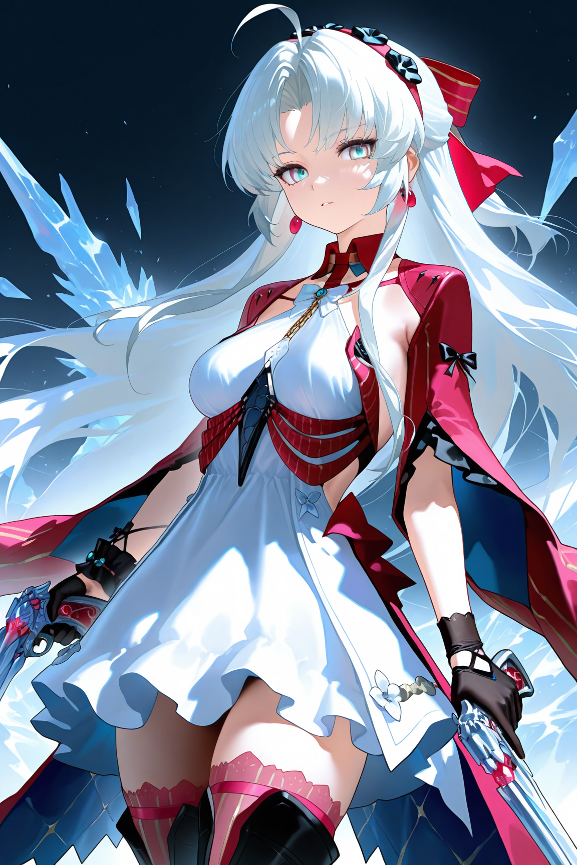 carlotta \(wuthering waves\), 1girl, solo, hairband, long hair, thighhighs, dress, green eyes, gloves, white dress, white hair, breasts, looking at viewer, earrings, jewelry, black gloves, medium breasts, ice, ahoge, bow,