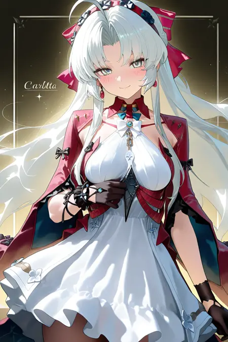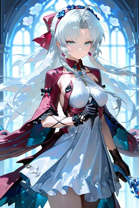 carlotta \(wuthering waves\), 1girl, solo, long hair, dress, green eyes, gloves, white dress, white hair, earrings, jewelry, ahoge, bow, hairband,