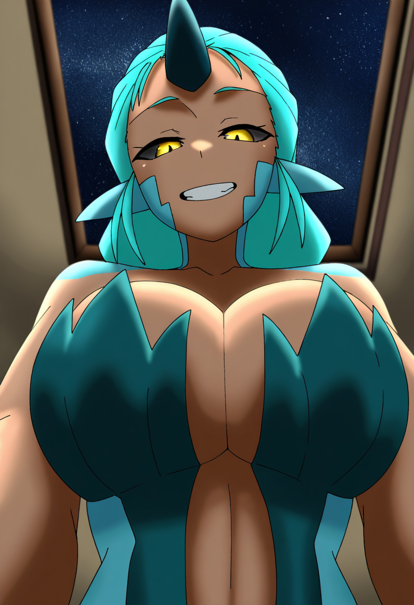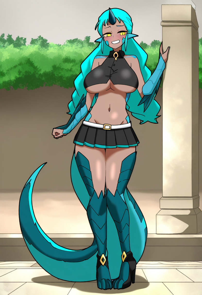 - Lamia_GBean, 長い髪, 黄色い目, 水色の髪, 尖った耳, 頭部のヒレ, 単一の角, モンスター娘, 暗い肌の女性