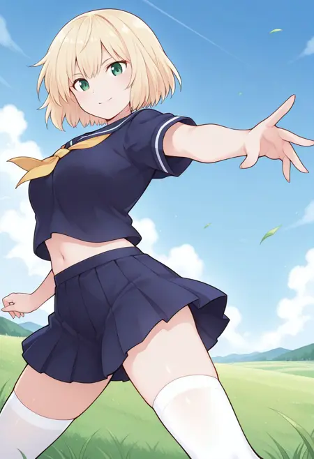 costume3: midriff, navel, school uniform, blue serafuku, short sleeves, pleated skirt, white thighhighs, zettai ryouiki,