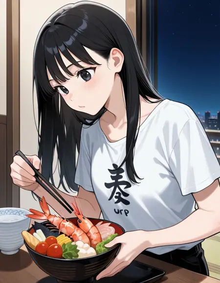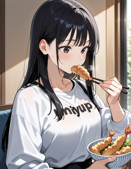holding, bowl, table, pov across table, chopsticks, tendon, eating tendon, tempura,