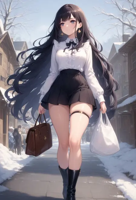 • 長い黒髪、ゴールドの星型のイヤリング、中程度の胸、紫色の目、