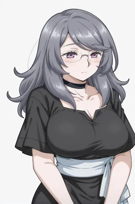 프롬프트: mojimom, 안경, 긴 머리, 프레임 없는 안경, 젖힌 앞머리, 보라색 눈, 회색 머리, 성숙함