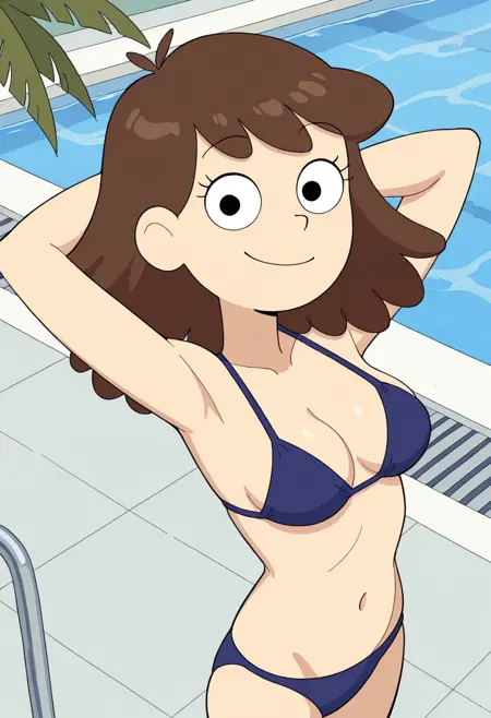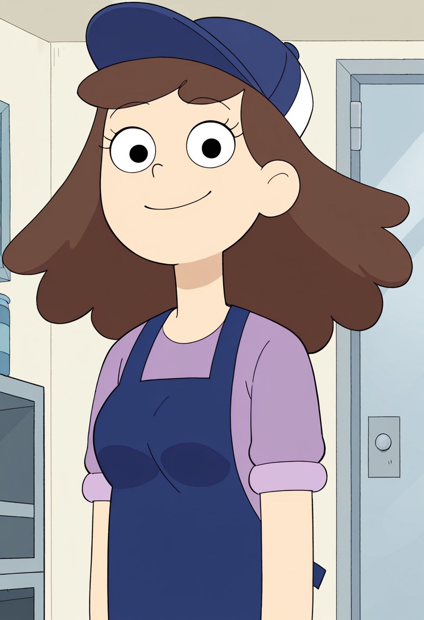 1girl, solo, Samplelady_C, 밝은 피부, 검은 눈, 볼륨 있는 머리, 갈색 머리, 중간 길이 머리, 흰색 디테일이 있는 진한 파란 모자