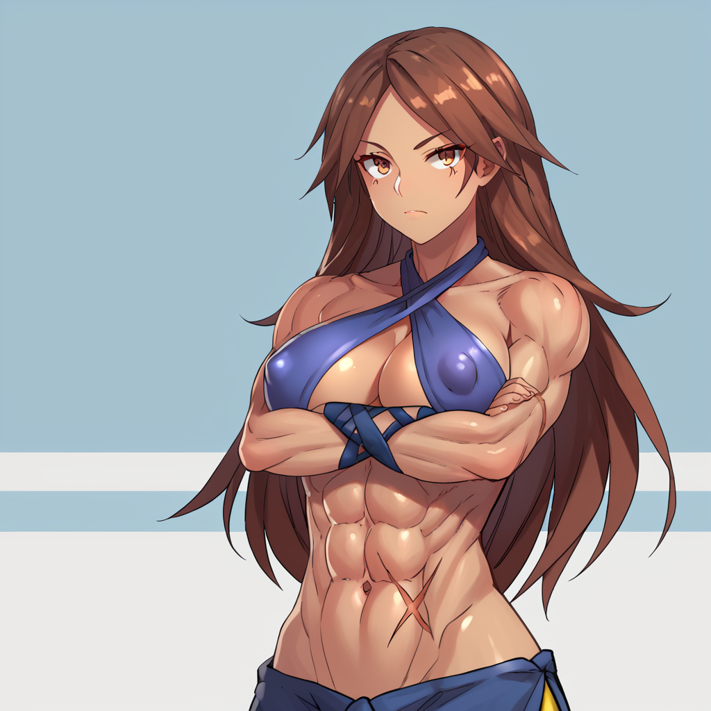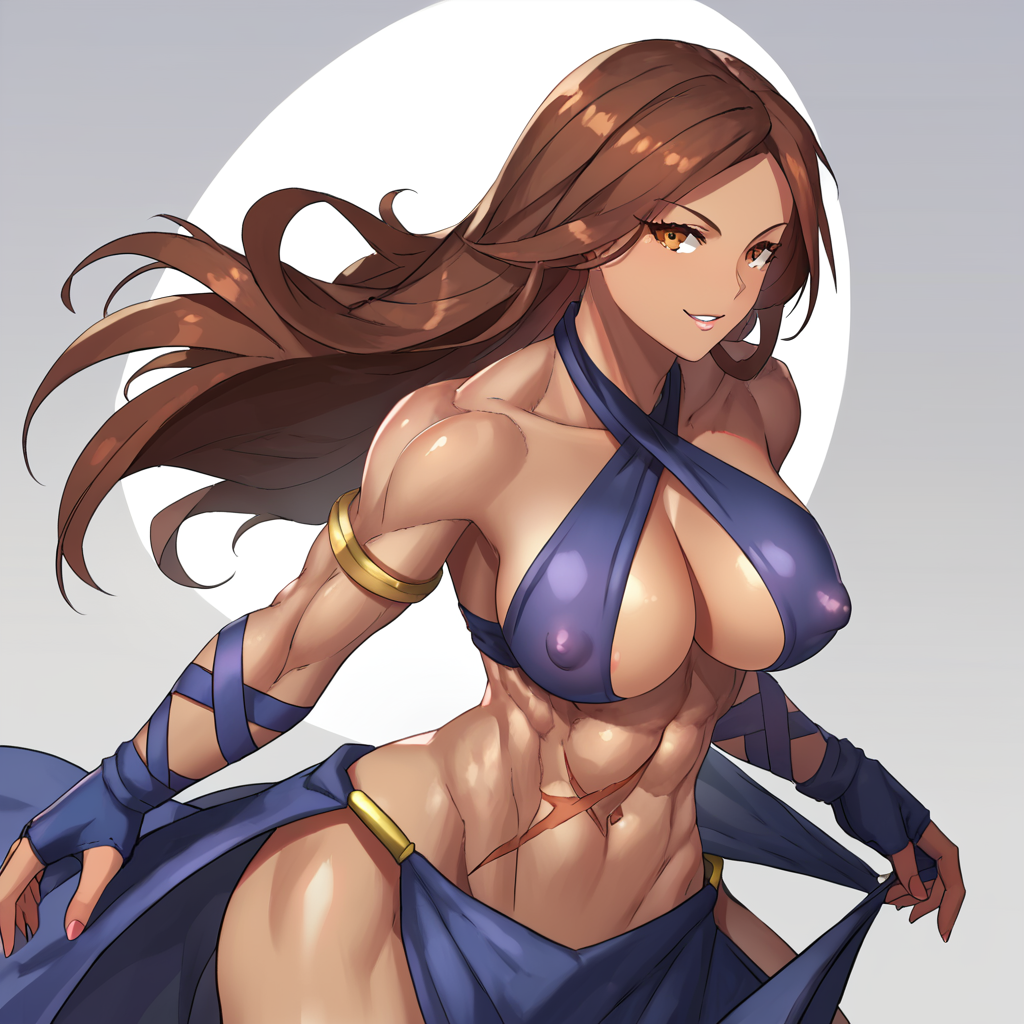 DNF_FMB, 1girl, solo, brown hair, long hair, brown eyes, dark-skinned female, large breasts, toned, abs, scar, halterneck, criss-cross halter, covered nipples, cleavage, navel, fingerless gloves