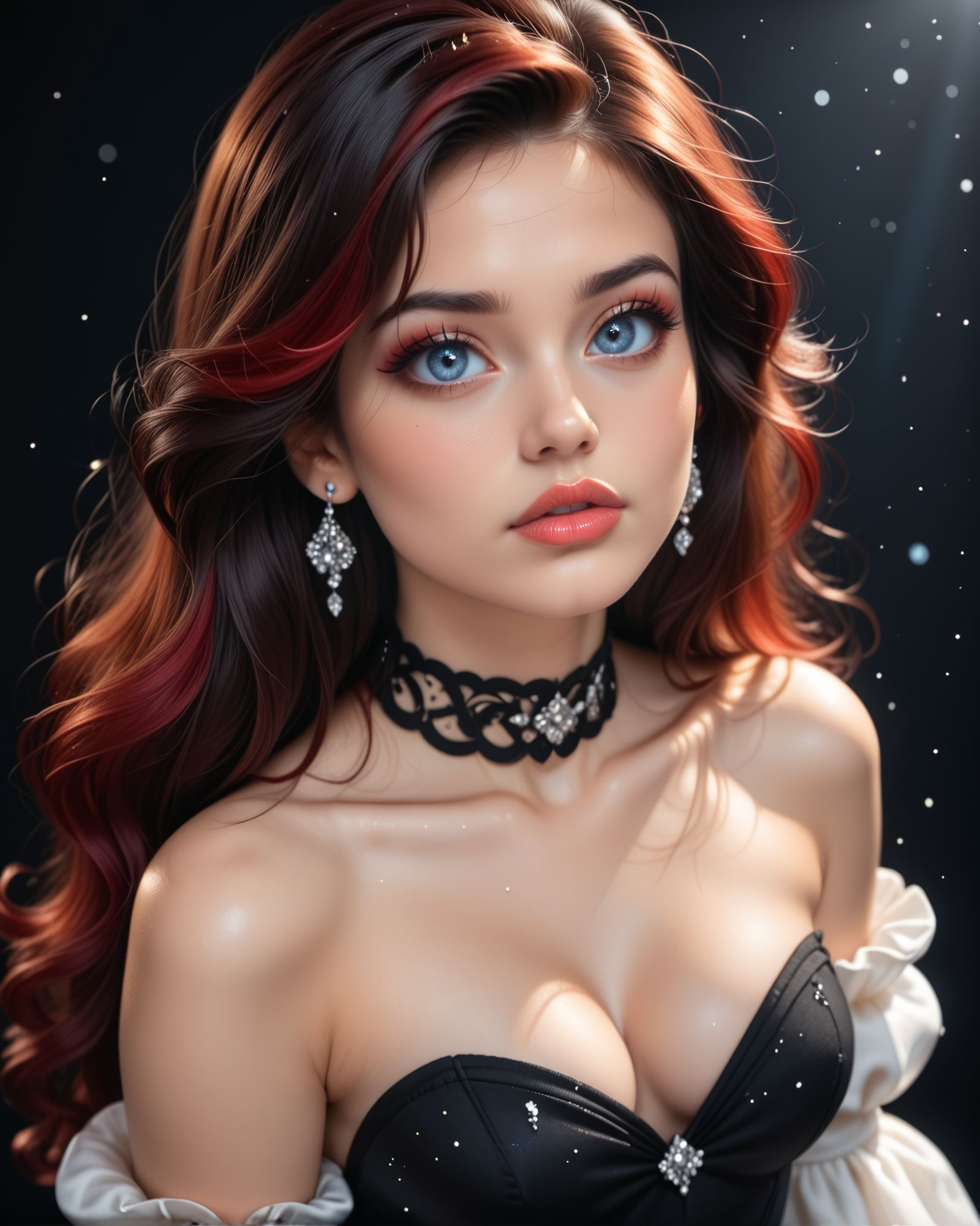 woman, full lips, blue eyes, dark red hair, red highlights, puffy hair, long hair,