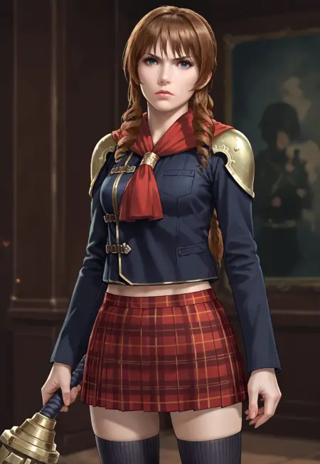 Outfit - uniform, jacket, shoulder armor, cape, plaid skirt, thighhighs, shoes