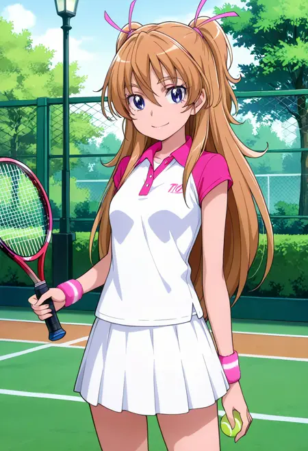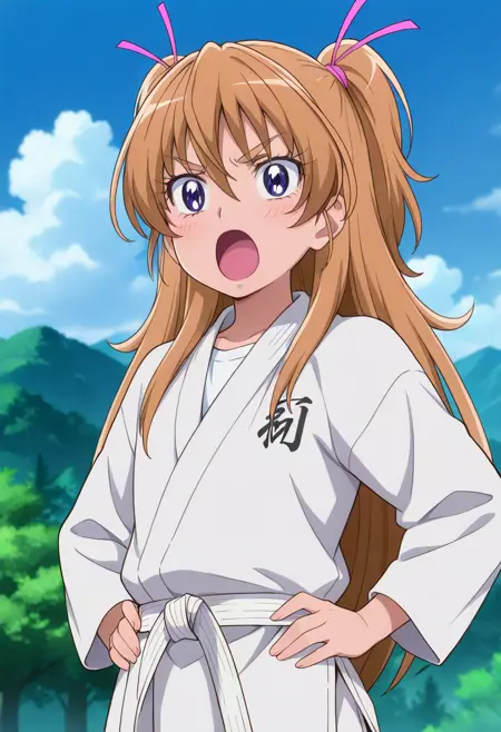 houjou hibiki, two side up, half updo, brown hair, orange hair, blonde hair, hair between eyes, long hair, eyelashes, eyebrows visible through hair, blue eyes, hair ribbon, pink ribbon