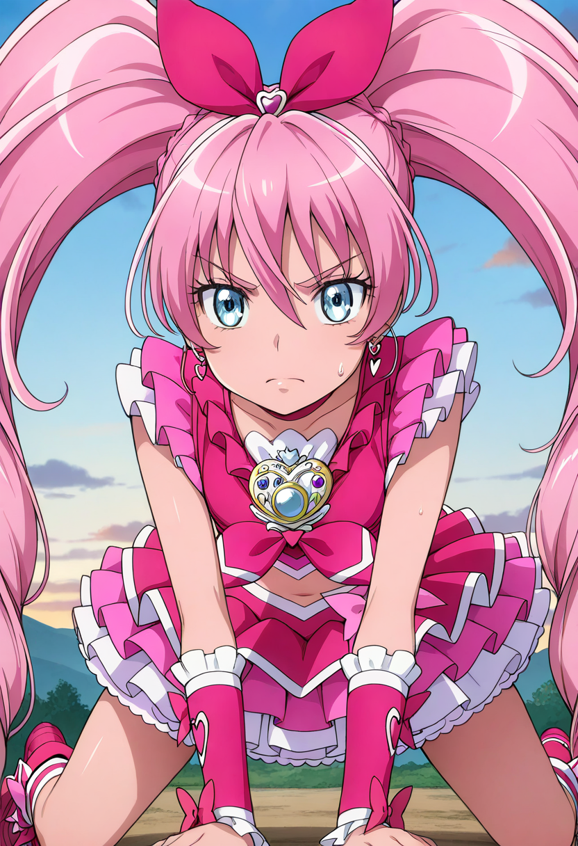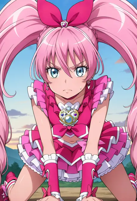 cure melody, pink hair, twintails, very long hair, hair between eyes, braid, eyelashes, eyebrows visible through hair, blue eyes, crop top, pink shirt, frilled shirt, frilled sleeves, pink choker, ribbon choker, pink neckwear, hair bow, pink bow, hair ornament, hairband, heart earrings, brooch, wrist cuffs, arm warmers, pink skirt, frilled skirt, layered skirt, miniskirt, petticoat, pink legwear, pink thighhighs, pink footwear, thigh boots, midriff, navel
