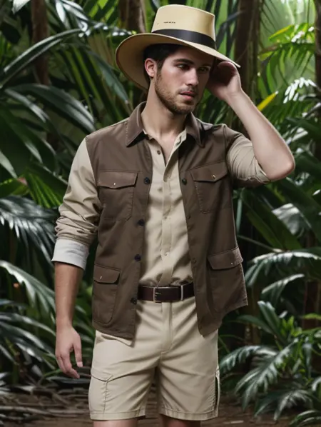 추가 도움이 되는 단어: 흰색 셔츠, 갈색 반바지, 갈색 바지, 갈색 모자, 정글