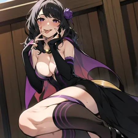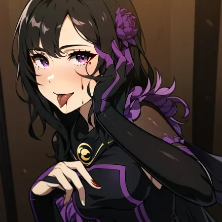 推荐标签:斗篷、毛边、肚脐、双面布料、黑色连衣裙、紫色眼睛、长发、新娘手套。