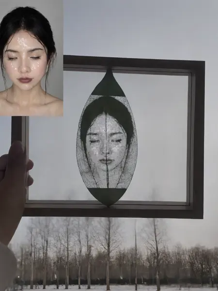 一只手握着一个深色边框的镂空相框,相框里面是一片经过叶脉雕刻技术处理的树叶,透过背后比较明亮的天空,可以看到树叶上的人像,和左上角小图里的女子是同一个人,自然光,上方有较强的光线,手下和相框下方有淡淡的阴影,画质清晰