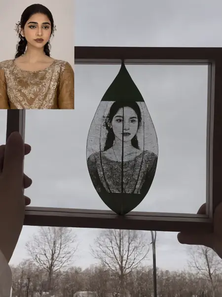 A hand holding a hollow photo frame with a dark border,a leaf processed by leaf vein carving technique inside the frame,a portrait on the leaf visible through the relatively bright sky behind,the same person as the woman in the small picture in the upper left corner,natural light,strong light from above,faint shadows under the hand and the frame,clear image quality