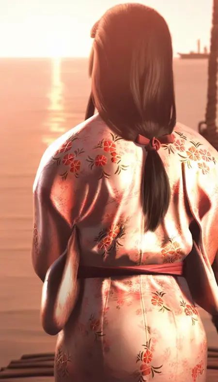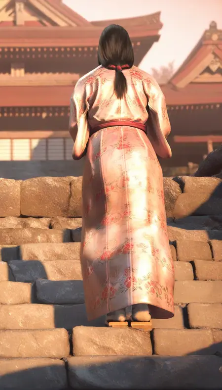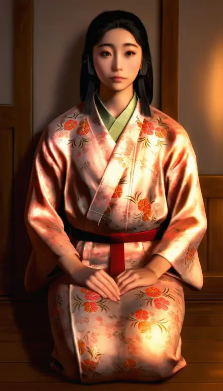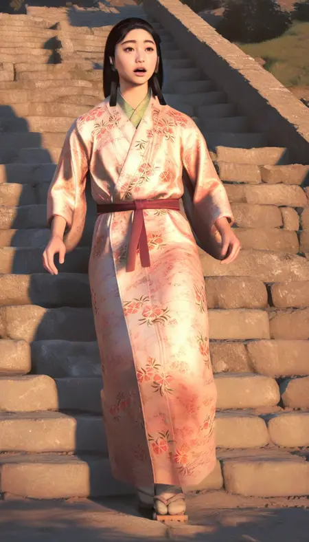 oich1, realistic, 1girl, solo, black hair, hime cut, brown eyes, lighting pink kimono, red sash, white tabi, geta,