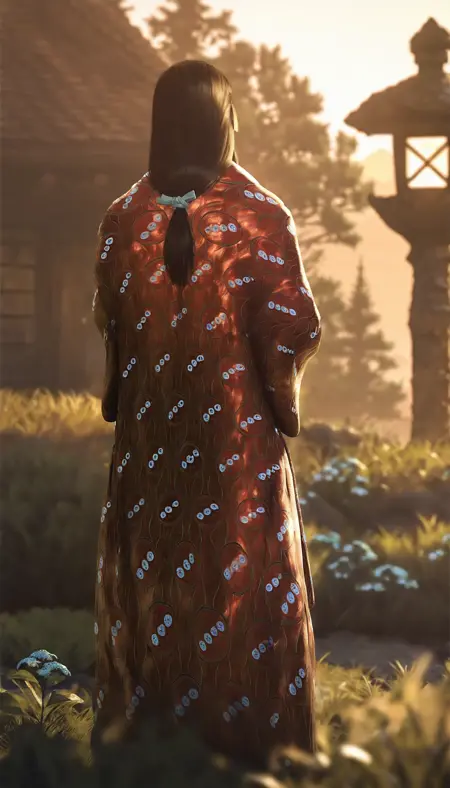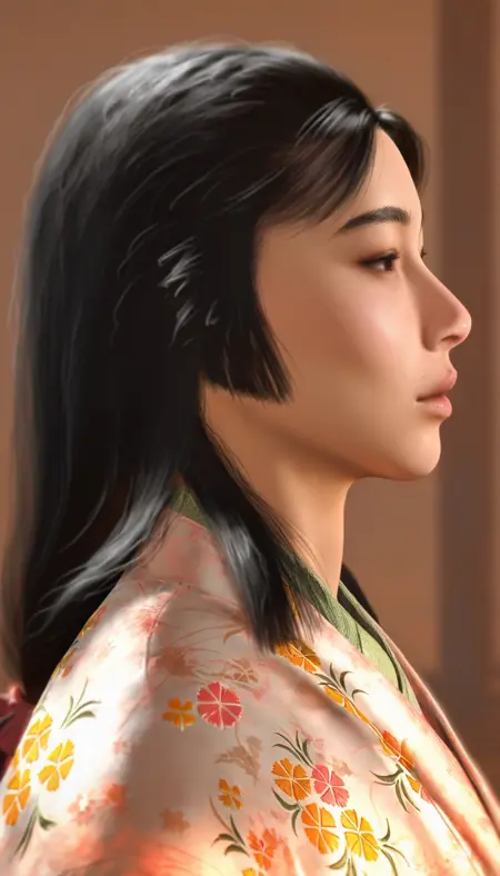 oich1, realistic, 1girl, solo, black hair, hime cut, brown eyes, red uchikake, white kimono, white tabi, geta,