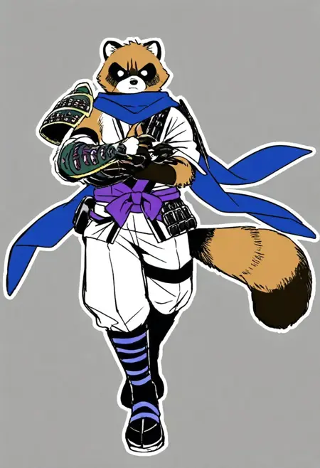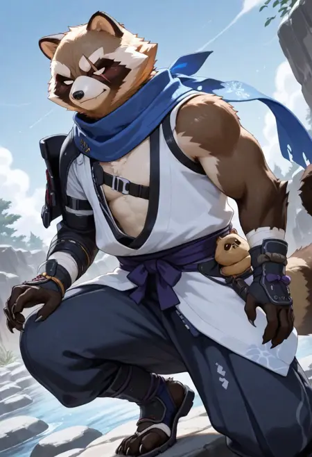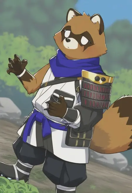 たぬき、フューリー、茶色の毛、爪、傷、顔の傷、目を横切る傷、アライグマの尾、アライグマの耳、白い目