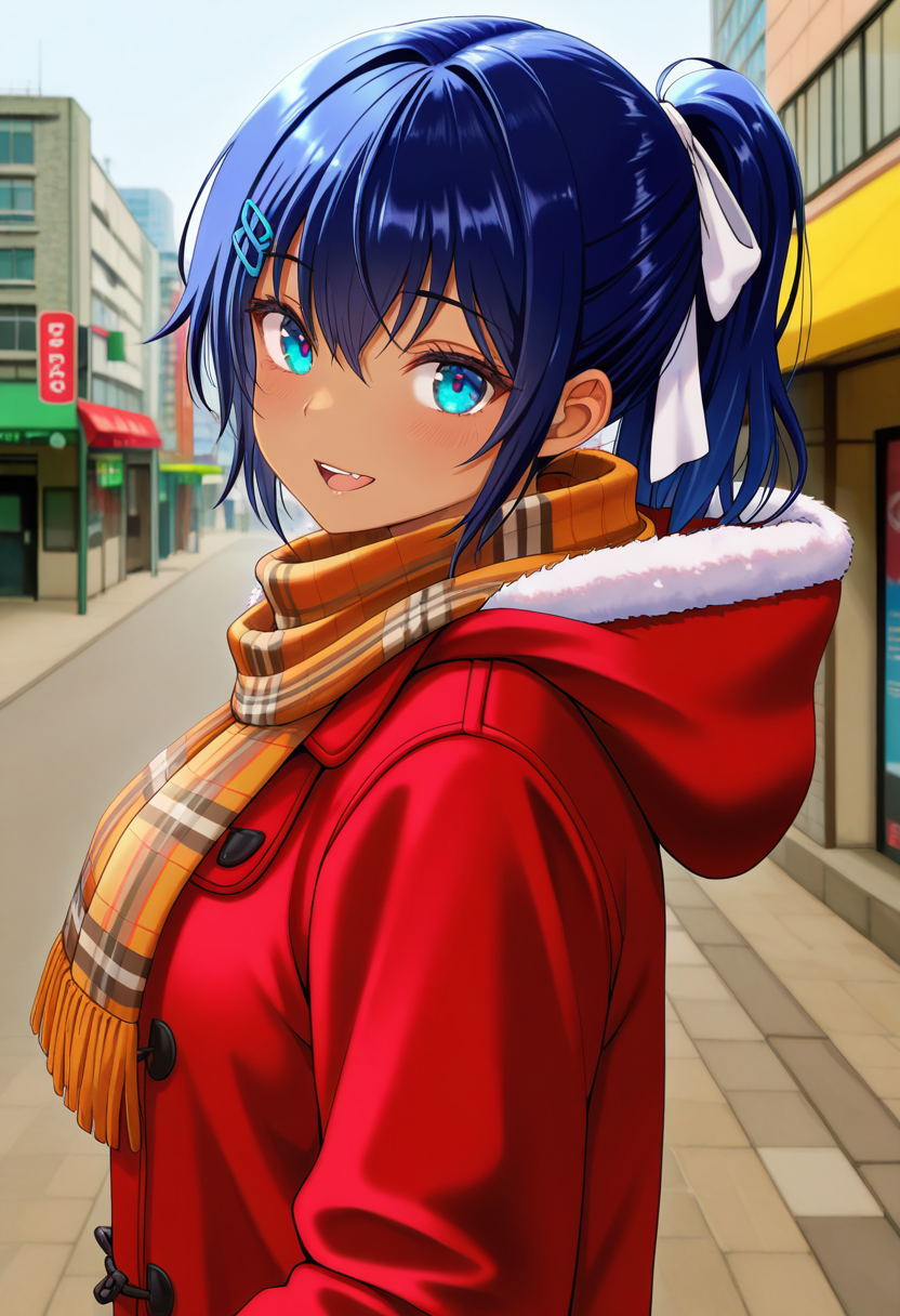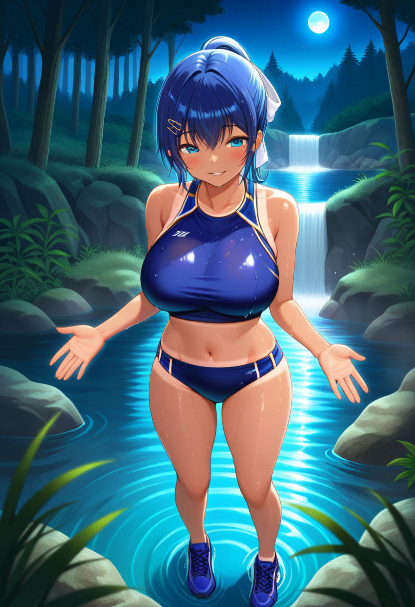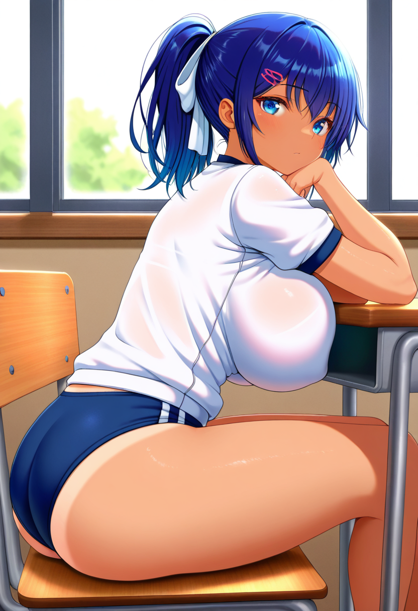 misakiww, dark skin, dark-skinned female, tan, tanlines, blue eyes, blue hair, ponytail, bangs, hair between eyes, sidelocks, hair ornament, hairclip, hair ribbon, large breasts,