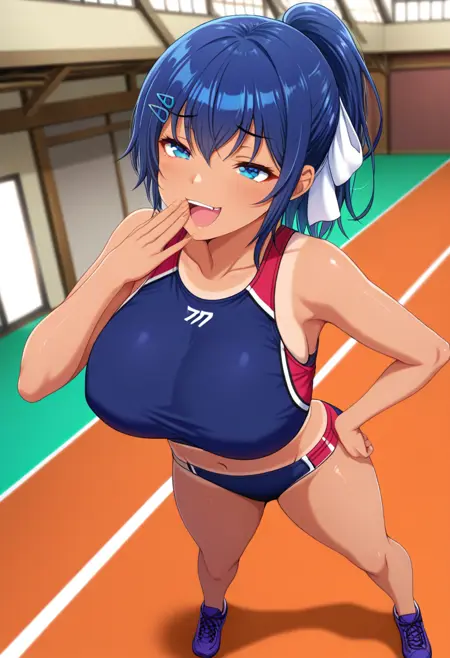 breasts, track uniform, sports bra, sports bikini, buruma, midriff, navel, sneakers,