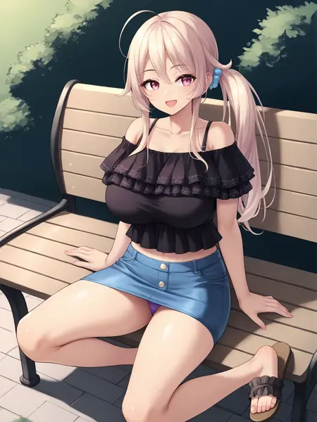 outfit02, shirt, black shirt, off shoulder shirt, frilled shirt, bra straps, skirt, blue skirt, denim skirt, pencil skirt, mini skirt, sandals, collarbone, underwear, purple underwear,